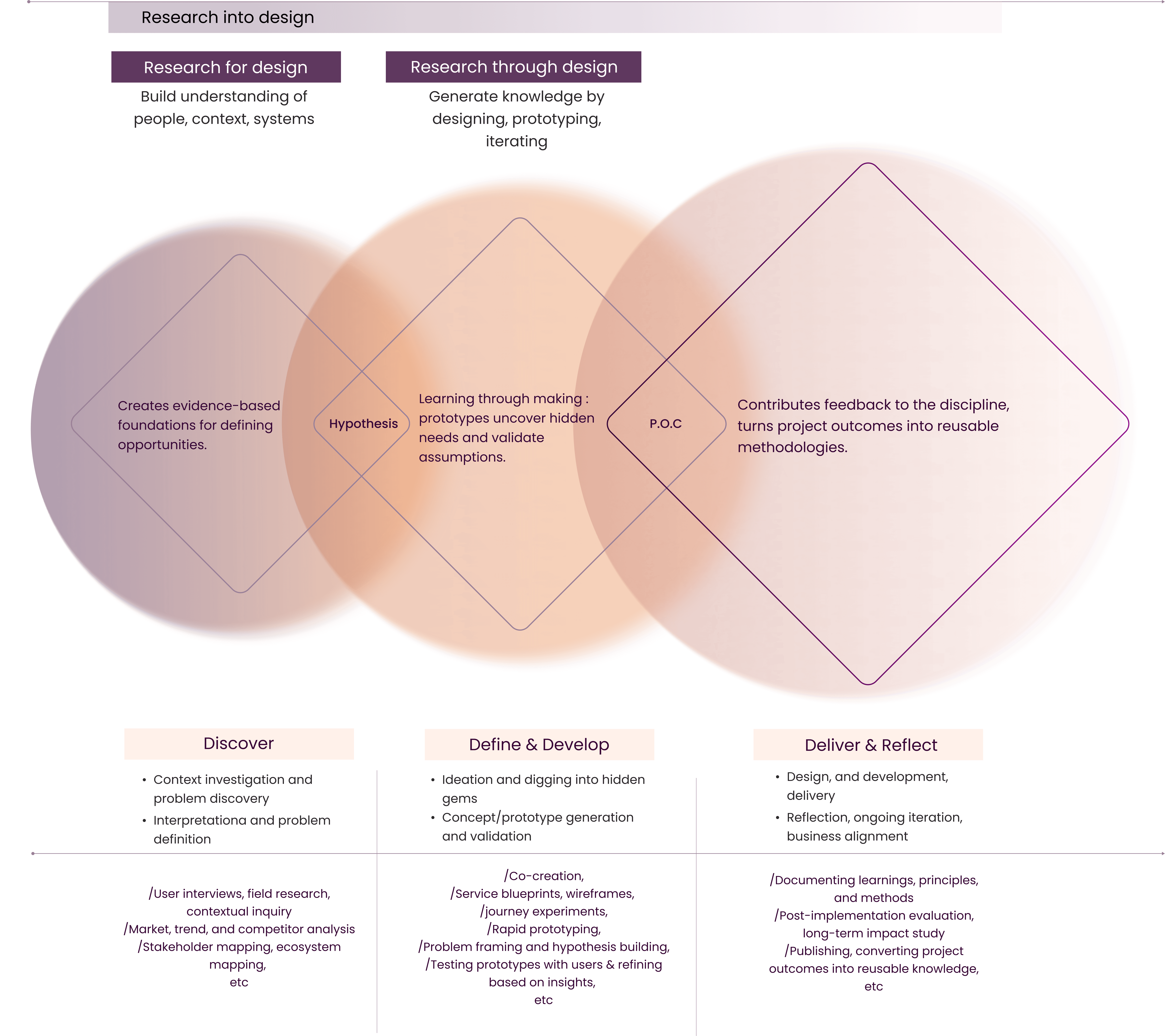 Applying the triple-diamond service design model, I aligned my research approaches as follows: insight gathering, iterative prototyping and knowledge generation, delivery and reflection.